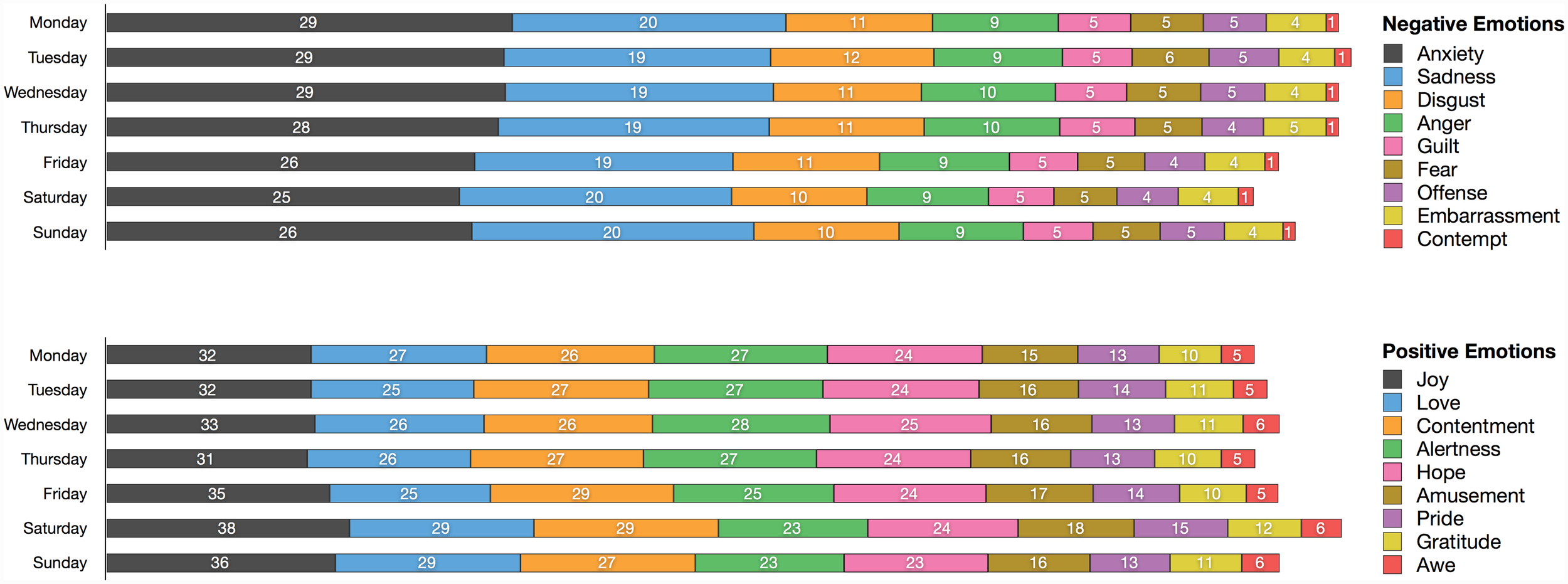 По сравнению с положительными эмоциями, не было обнаружено заметных изменений в динамике отрицательных в зависимости от времени суток. Средний объем изменений положительных эмоций был в три раза выше, чем отрицательных. Следует отметить, что, так как подавляющее большинство опросов было выполнено в дневное время, исследователи проанализировали изменение эмоций только в промежуток с 9 утра до 10 вечера.