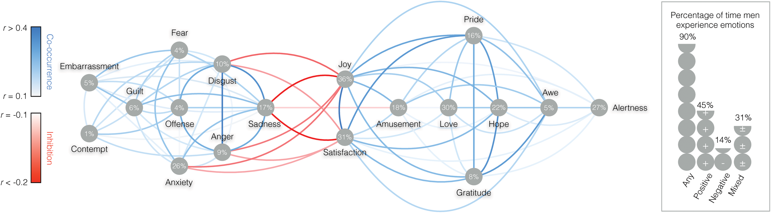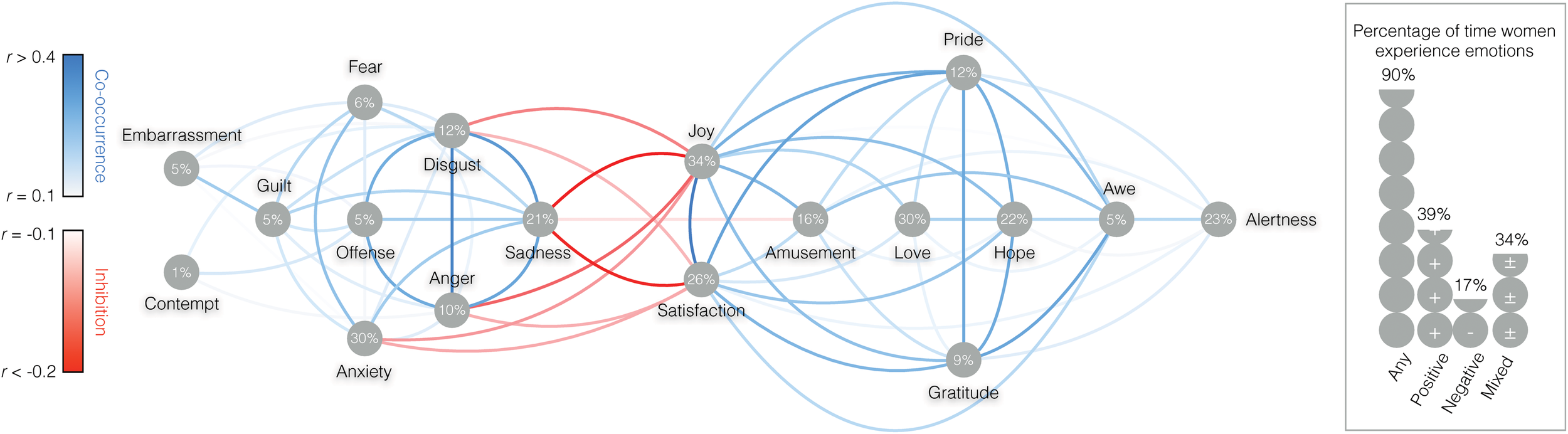 В среднем, люди испытывали эмоции 90% времени. В частности, участники переживали одну или несколько положительных эмоций 41% времени и 16% времени одну или несколько отрицательных, и как минимум одну положительную и одну отрицательную эмоцию одновременно 33% времени. В топ-3 наиболее часто переживаемых положительных эмоций вошли радость (35% времени), любовь (30%) и удовлетворение 27%). Из отрицательных эмоций наиболее частыми были тревога (29%), грусть (20%) и отвращение (11%). Что касается смешанных эмоций, то из пар эмоций противоположной валентности наиболее частой была пара тревоги и любви.